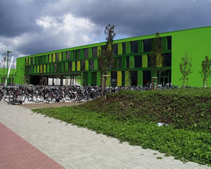 Das Gelände wird in differenzierte Felder und Bereiche aufgeteilt, die den verschiedenen Nutzungen entsprechen. Begleitend zur Dieckmannstraße befinden sich unter Baumdächern die Fahrrad- und PKW-Stellplätze. Diese dichten Baumgruppen werden immer wieder von kleineren Schneisen sowie dem Vorplatz unterbrochen, wodurch das Gebäude von der Straße in ständig wechselnden Sequenzen wahrgenommen wird. Die unterschiedlichen Verkehrsströme sind so entzerrt und Überschneidungen und Kreuzungen können dadurch vermieden werden.